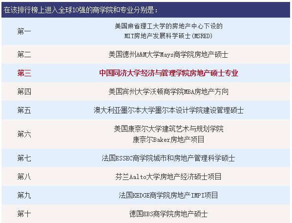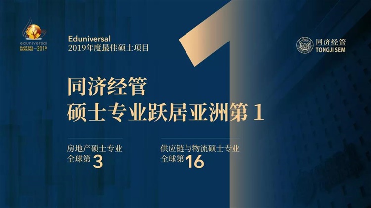 近日,Eduniversal机构发布全球最佳管理硕士排名,同济大学经济与管理学院房地产硕士专业(Master Programme for Real Estate)位列全球第三,连续两年排名持续上升,从2017年排名全球第27位,到2018年排名全球第9位,2019年继续攀升,一步进入全球三甲行列。