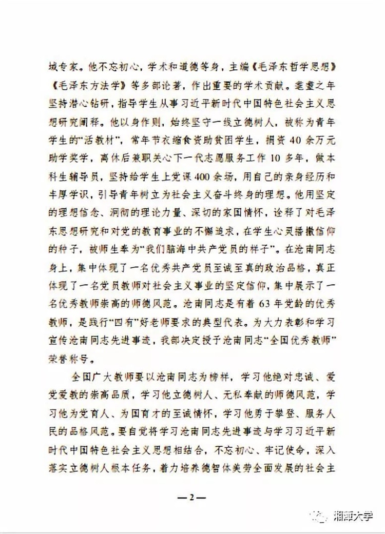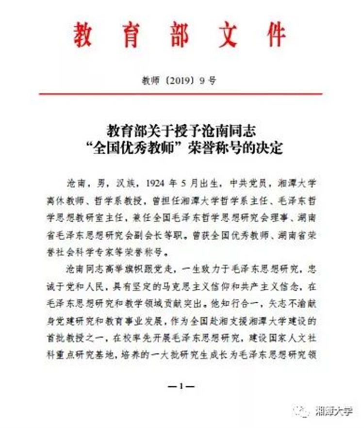 教育部2019年12月2日印发文件,授予湘潭大学沧南教授“全国优秀教师”荣誉称号。