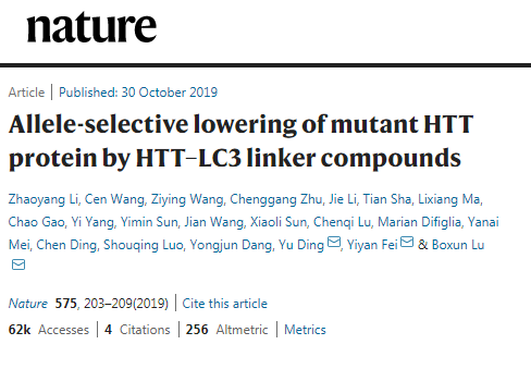 12月13日,《自然》(Nature)选出2019年度十大杰出论文(10 remarkable papers from 2019),复旦大学生命科学学院鲁伯埙与丁澦课题组(医学神经生物学国家重点实验室、脑科学教育部前沿科学中心、复旦大学附属华山医院)和复旦大学信息科学与工程学院光科学与工程系费义艳课题组(微纳光子结构教育部重点实验室、上海超精密光学制造工程技术研究中心)合作研究成果《HTT-LC3连接化合物对变异HTT蛋白的等位基因选择性降低》(“Allele-selective Lowering of Mutant HTT Protein by HTT-LC3 Linker Compounds”)入选。
