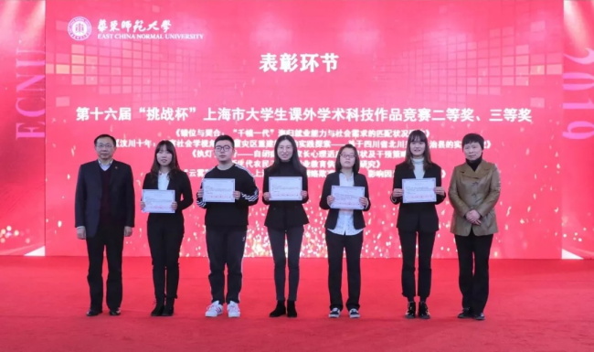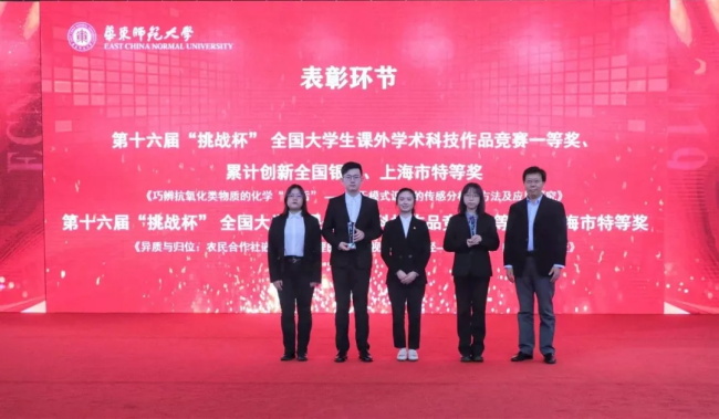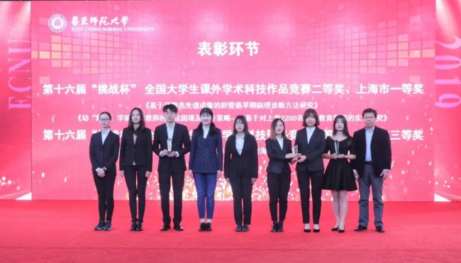 2019年,在第十六届“挑战杯”全国大学生课外学术科技作品竞赛中,华东师大6个国赛团队以充沛饱满的信心与热情,追逐热血的青春之梦,取得优异成绩,获得一等奖2项、二等奖3项、三等奖1项、“累进创新奖”全国银奖,时隔8年再次捧得“优胜杯”。