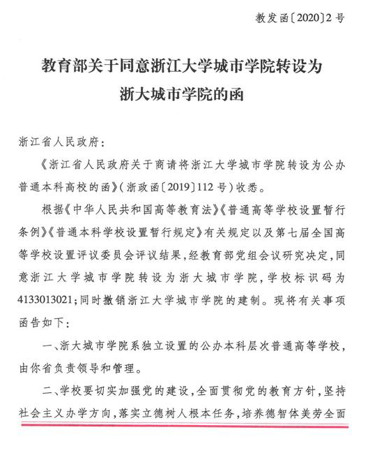 近日,教育部批复《同意浙江大学城市学院转设为浙大城市学院的函》,浙大城市学院正式成为独立设置的公办本科层次普通高等学校,学校标识码为4133013021,同时撤销浙江大学城市学院的建制。