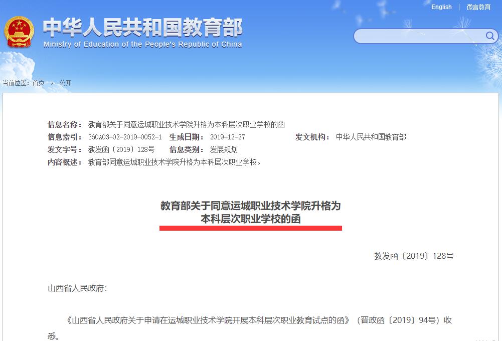 1月19日,教育部发布了《教育部关于同意运城职业技术学院升格为本科层次职业学校的函》。