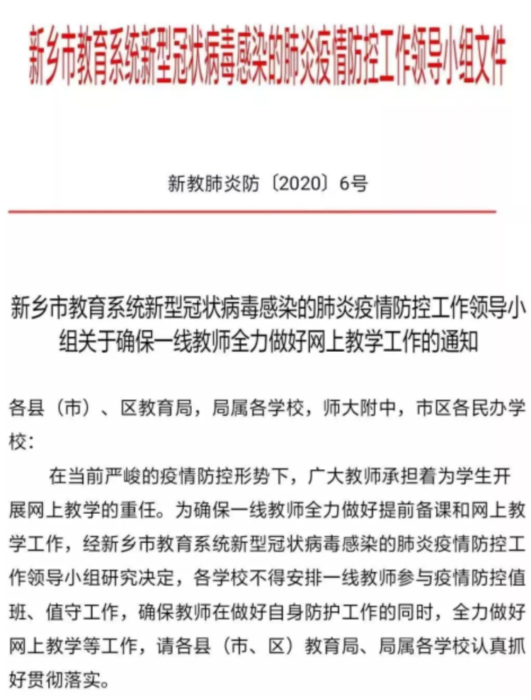 近日,河南省开封市、洛阳市、新乡市、濮阳市、三门峡市、南阳市、信阳市、驻马店市等地相继下发通知,要求各学校不得安排一线教师参与疫情防控值班、值守工作,确保教师在做好自身防护工作的同时,全力做好网上教学、在线辅导工作。