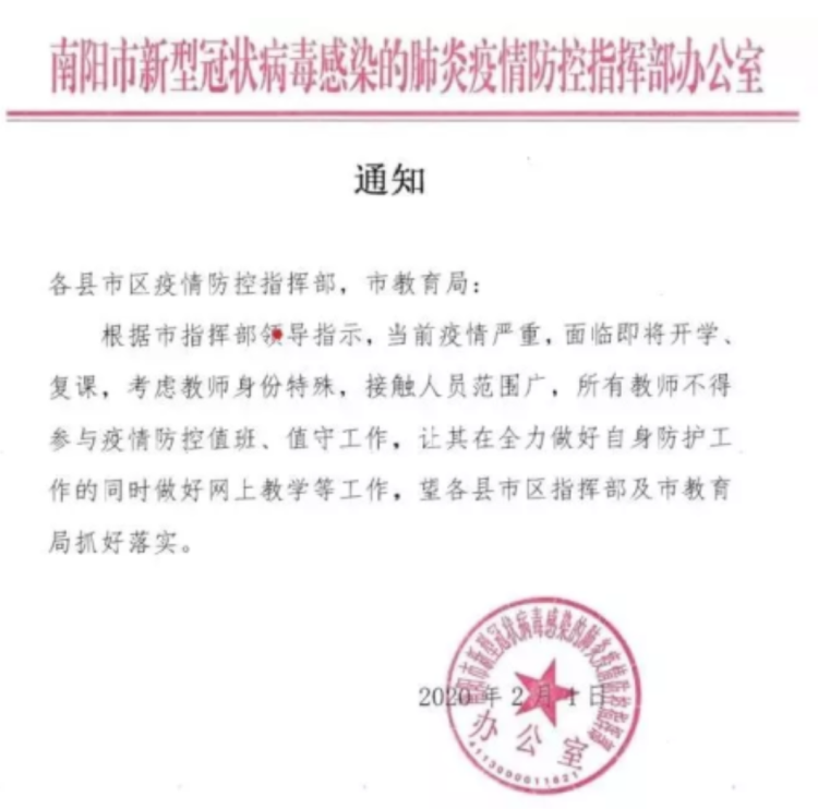 南阳市:各学校不得安排一线教师参与疫情防控值班、值守工作