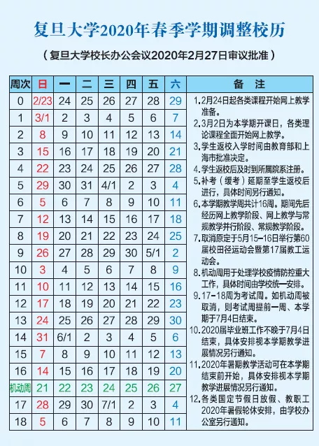 三、17—18周为考试周。如机动周被取消,则考试周提前一周、春季学期于7月4日结束。