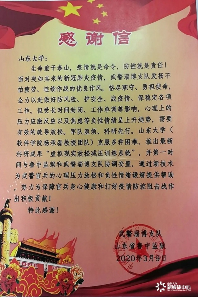 近日,大山收到一封来自武警淄博支队的感谢信,感谢山东大学软件学院杨承磊教授团队推出的最新科研成果“虚拟现实放松减压训练系统”,在疫情当前,高压运转的工作环境下,通过新技术为长时间在抗疫、战疫一线的武警官兵放松心理压力和缓解负性情绪提供帮助。