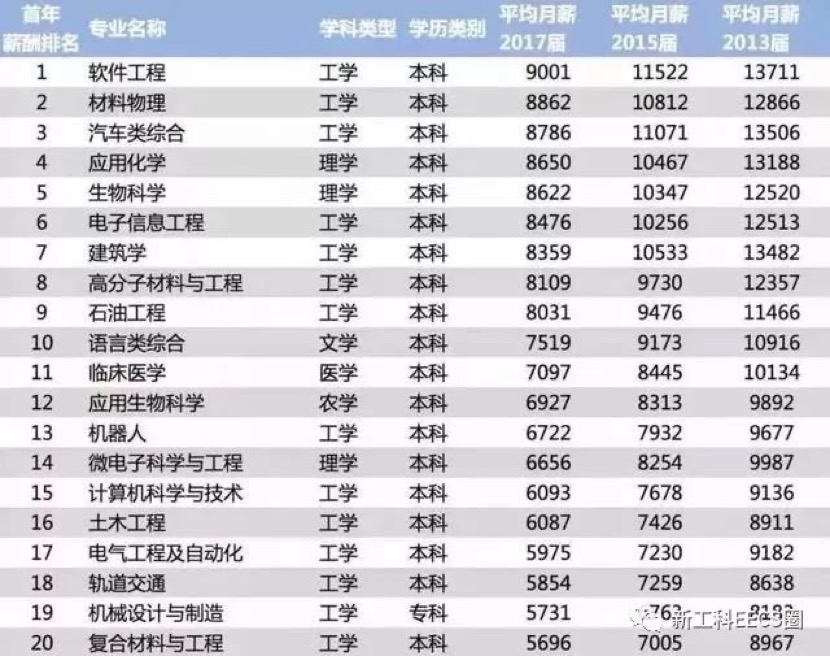 据统计,在工科的薪酬排行榜中软件工程师的薪酬要高于材料、汽车、化学、生物科学、信息通信、临床医学等学科。