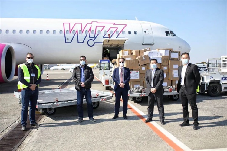 匈牙利创新技术部部长顾问伊凡·科瓦斯奇,匈牙利中央银行行长顾问、复旦大学校友乐文特及中国银行当地负责人一同在机场接收物资
