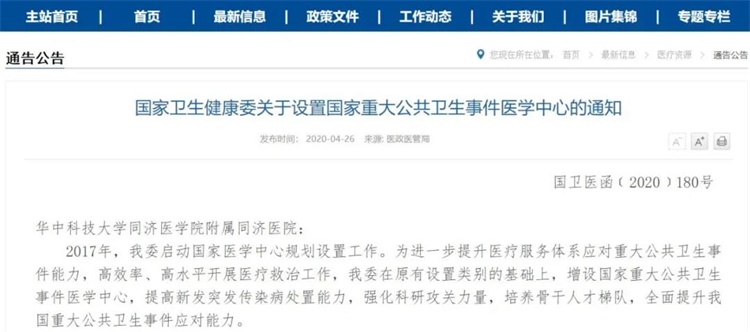 为提高新发突发传染病处置能力,提升全国重大公共卫生事件应对能力和医疗救治水平,国家卫健委下文,决定在现有国家医学中心规划的基础上,增设国家重大公共卫生事件医学中心。该中心将落户在此次抗击新冠肺炎疫情中表现突出的华中科技大学同济医学院附属同济医院。