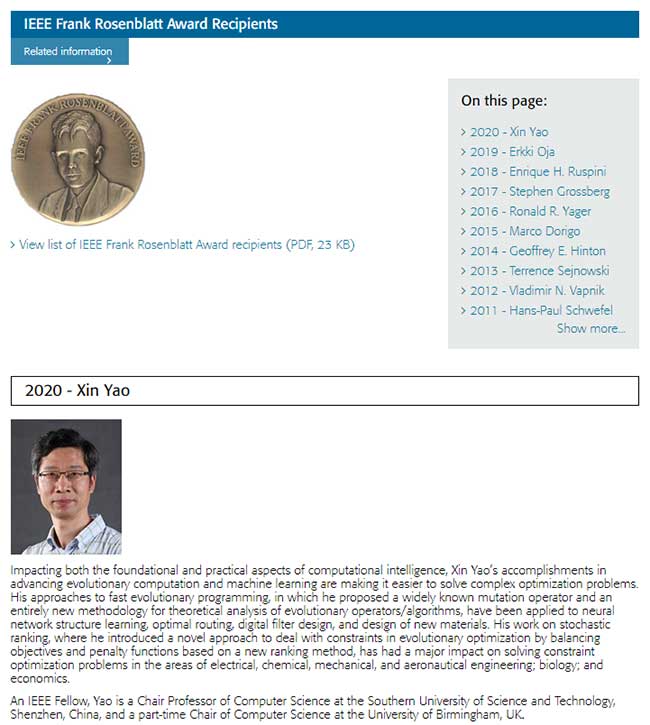 近日,电气和电子工程师协会(Institute of Electrical and Electronics Engineers,IEEE)网站公布2020年度IEEE FRANK ROSENBLATT AWARD国际大奖获奖者信息,南方科技大学计算机科学与工程系主任、讲席教授姚新因其在计算智能领域的杰出贡献获奖,成为该奖年度全球唯一获得者,也是获得该奖项的首位华人。