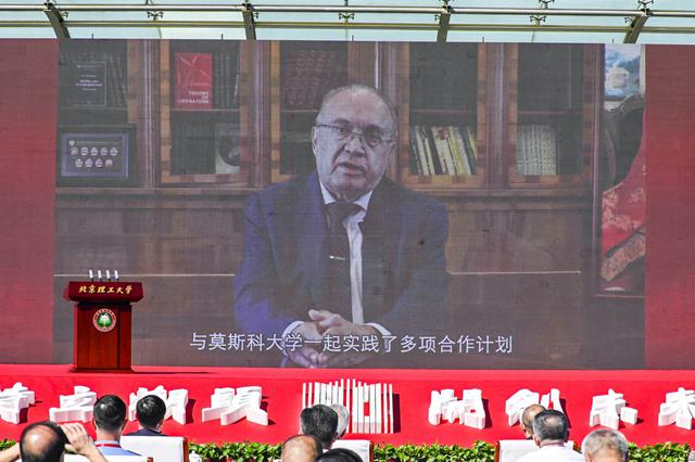 俄罗斯莫斯科罗蒙诺索夫国立大学校长萨多夫尼奇代表国外合作大学通过视频致辞。他讲到,北京理工大学是莫斯科大学的坚定合作伙伴,两校携手创立的第一所俄中合作大学——深圳北理莫斯科大学已经在人才培养、平台建设等方面取得重要成果。他期望两校深化合作,为两国教育合作深入发展作出新的贡献。