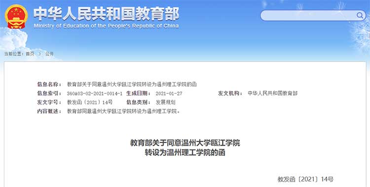《浙江省人民政府关于商请将温州大学瓯江学院转设为公办普通本科高校的函》(浙政函〔2020〕107号)收悉。
