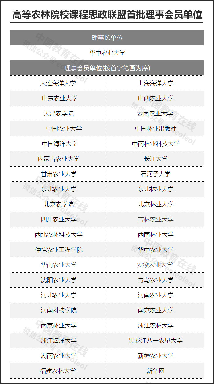 5月15日,高等农林院校课程思政联盟成立暨全国高等农林院校课程思政建设高峰论坛在华中农业大学举行。会上,与会代表审议并通过了《高等农林院校课程思政联盟章程》和首届联盟组织机构组成名单。教育部高等教育司人文社科教育处处长张庆国宣布高等农林院校课程思政联盟成立。