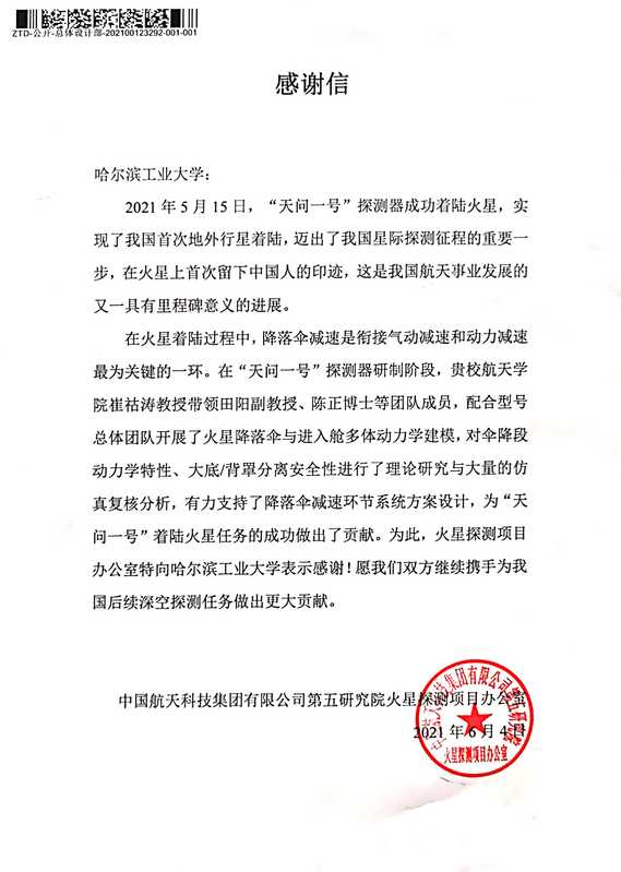 近日,中国航天科技集团有限公司第五研究院火星探测项目办公室给哈尔滨工业大学发来感谢信,感谢哈尔滨工业大学航天学院崔祜涛教授团队为“天问一号”成功着陆火星任务做出的贡献,希望双方继续携手为我国后续深空探测任务做出更大贡献。