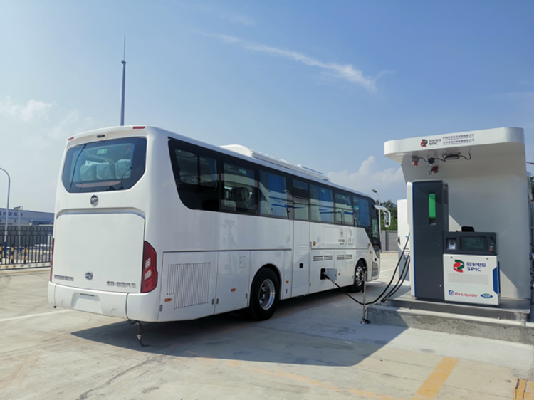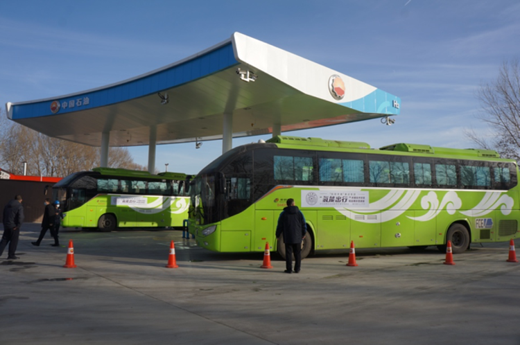 氢燃料电池大巴车在国电投延庆园加氢站加氢中