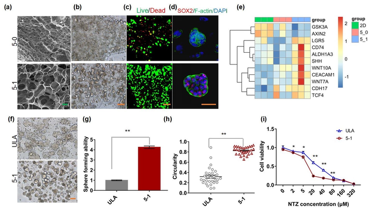 图2.三维打印的杂化水凝胶具有诱导富集CSCs的特性,其诱导的CSCs球可作为靶向CSCs药物筛选模型。(a-c)杂化水凝胶具有良好的孔隙率和生物相容性;(d-e)杂化水凝胶来源细胞微球的干性增强;(f-i)杂化水凝胶诱导富集的干细胞球更多、更均一且对靶向CSCs药物更加敏感。