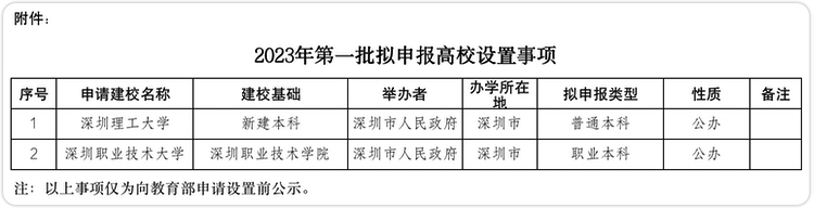 根据《中华人民共和国高等教育法》《普通本科学校设置暂行规定》《本科层次职业学校设置标准(试行)》等有关规定,为做好2023年第一批拟申报高校设置事项相关工作,经省高等学校设置评议委员会专家考察和评议,现对拟向教育部申报设立深圳理工大学等2个事项向社会公示。