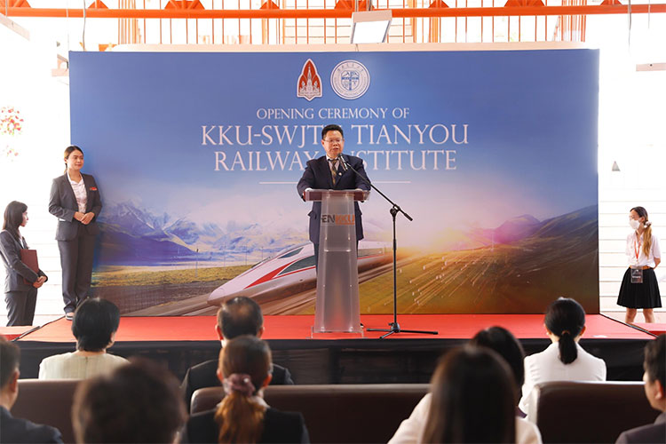 拉差蓬在讲话中说,该学院自从2021年起与西南交通大学签署合作协议,共同开发课程以来,双方保持密切交流,他曾亲自带队赴华访问,洽谈联合开设课程等,直至顺利揭牌成立天佑铁道学院。他表示,孔敬大学工学院的愿景是为未来的全球社会培养优质毕业生,包括在数字信息时代培养高铁工程领域优质的毕业生,天佑铁道学院将在激烈的市场竞争中为学生提高就业机会,提升用人单位接受度。