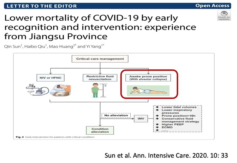 新冠疫情初期,东南大学附属中大医院重症医学科主任杨毅教授及孙骎医师在全球首次提出清醒俯卧位理念,被国际同行广泛认可,为世界抗击新冠疫情、救治新冠患者提供了宝贵的“中国方案”。东南大学副校长、附属中大医院重症医学科学科带头人邱海波教授,时任中央指导组专家组成员和国家卫健委医疗救治专家组成员,第一时间奔赴武汉疫情最前线,根据在武汉金银潭医院等多家医院的救治效果,与专家组成员多次研讨后达成共识:对新冠患者进行长时间的俯卧位通气。在邱海波等专家的推动下,俯卧位通气治疗被写入《新型冠状病毒肺炎诊疗方案》及国际急性呼吸窘迫综合征(ARDS)诊疗指南,为重症、危重症患者救治明确了规范。