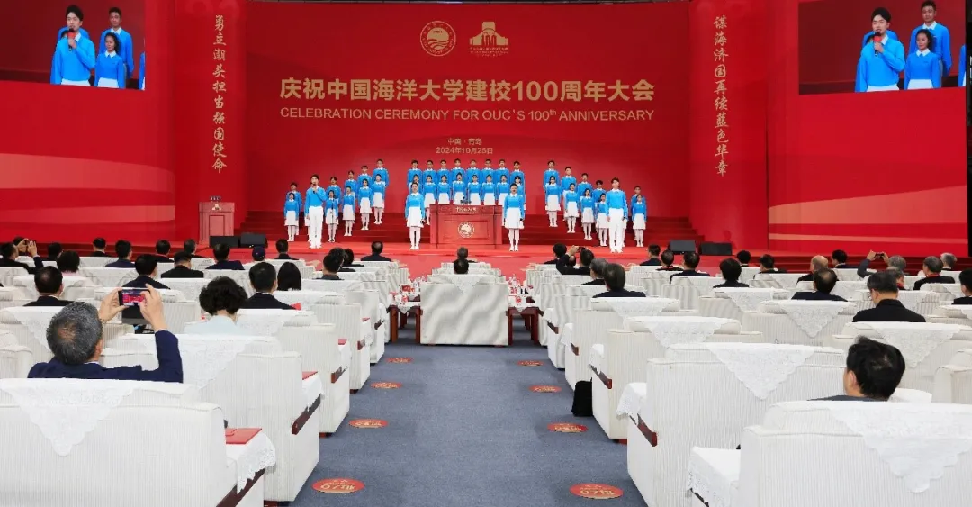 25日的中国海大校园,秋高气爽,阳光朗照,鲜花点缀,彩旗飘扬,处处洋溢着喜庆的节日氛围。上午10时,庆祝中国海洋大学建校100周年大会在崂山校区体育馆隆重举行。全校师生员工、海内外校友和关心中国海大发展的各界人士相聚线下线上,共襄盛举,共同见证中国海洋大学百年荣光。