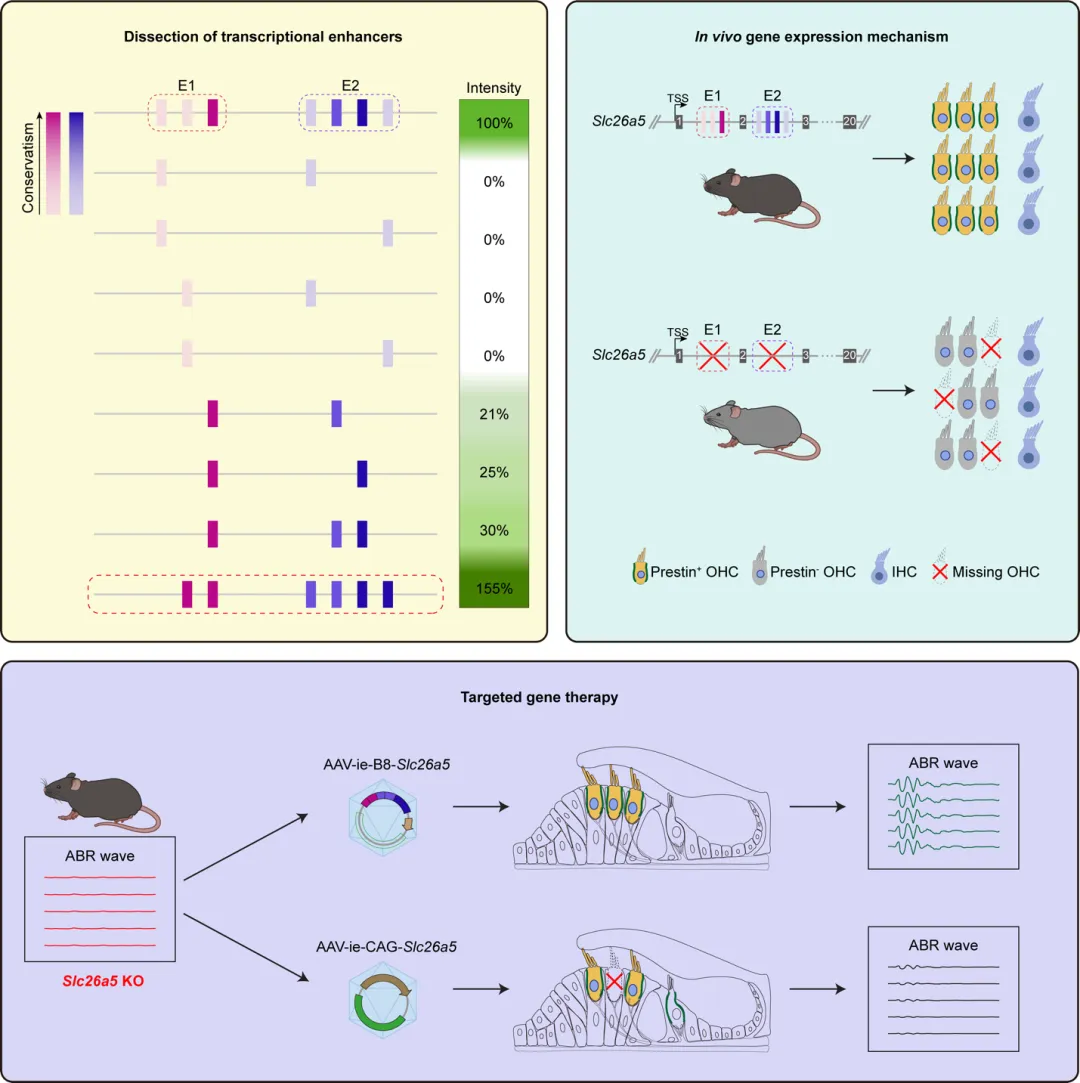 利用ARBITER系统解析并重组了Slc26a5的调控增强子,结合体内敲除小鼠模型验证了增强子对基因调控的重要作用,并最终将重构的细胞特异性增强子用于基因的精准递送,成功恢复了遗传性耳聋小鼠的听力