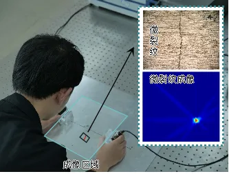 基于非线性超声的金属结构近表面微裂纹成像(实验人员在隔振平台上进行实验,检测对象的近表面含有微米级的微裂纹。如图所示,操作人员手里拿着两个传感器,形成一条检测路径,一个作为激励端,通过振动产生超声信号,另一个作为接收端,用来接收超声信号。检测路径上如果存在损伤,接收信号的非线性成分会增加,通过对比检测路径健康状况和损伤状况下接收信号中的非线性成分,就可以知道路径上是否存在损伤。通过布置多条路径,路径间就像蜘蛛网一样交织在一起,形成多个交点,经过损伤的路径会高亮显示,他们的交点就是损伤存在的位置。成像结果展示出非线性超声可以检测出金属板近表面的微裂纹损伤。)