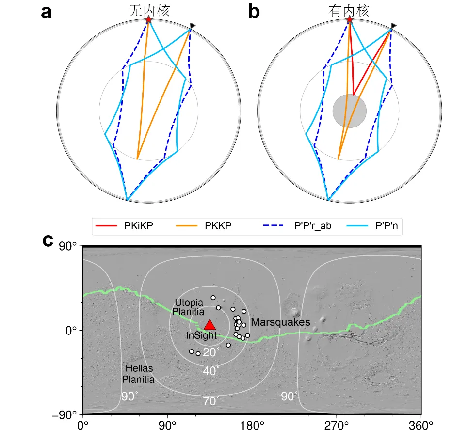为突破这一挑战,研究团队创新性地引入火震阵列分析方法,通过对23个信噪比较高的火震事件数据的分析,成功提取出穿过火星核的关键震相,如在地表反射的PKPPKP(P'P')和在核幔边界反射的PKKP(下图a)。特别值得注意的是,实际观测到的PKKP到时,较当前仅考虑液态核的火星速度模型所预测的结果提前了50至200秒。地震波在固体中的传播速度比在液体中快。因此,这一差异表明,火星核具有分层结构:即外层为液态核,而更深部则存在一个波速更高的固态内核。