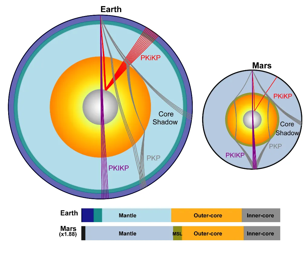 在进一步分析中,研究团队首次在火震数据中识别出被视为“固态内核标志”的 PKiKP 震相信号(上图b)。这一发现为火星存在固态内核提供了证据。结合不同火核震相,团队测得火星固态内核半径约 600 公里,占火星半径的 1/5(下图)。如将火星按比例放大至地球大小,其内外核结构比例与地球高度接近(下图)。