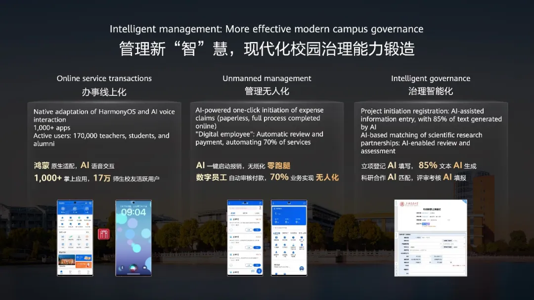 现代化校园治理体系和治理能力建设也离不开信息化技术。交大自主研发的“交我办”APP、“数字员工”等应用,实现了办事线上化、AI语音交互、鸿蒙适配等功能,成为服务师生的超级掌上办事厅。校园治理智能化之路稳步前行,为师生提供了更加便捷、高效的服务。