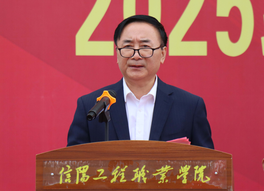 校党委副书记、校长黄功学以《以德铸魂强根基,以技赋能赢未来》为题发表主旨讲话。他首先向完成军训淬炼的新生们送上热烈祝贺,向烈日下坚守的教官、默默付出的辅导员致以诚挚谢意。谈及学校发展,黄功学如数家珍:565亩现代化校园内,智慧教室、实习实训基地一应俱全;图书馆藏书30万余册,实训设备总值超4000万元;与中国机械工业集团、比亚迪等行业龙头共建了5个产业学院。展望未来,他描绘出四大工程蓝图:从思政铸魂到人才强校,从质量提升到特色建设,每一项规划都锚定着建设高水平职业院校的目标。