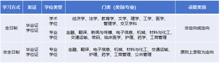 (2)报考类别:非定向就业:入学时须调入个人档案,毕业前按学校推荐、本人与用人单位双向选择的办法就业;定向就业:录取前应当与招生单位、用人单位签订定向就业合同,不调入个人档案。