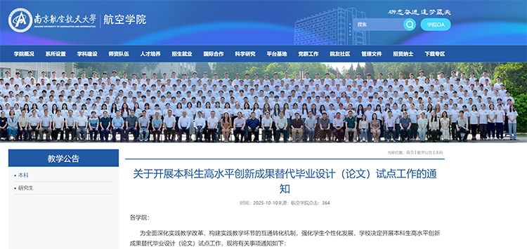 近日,南京航空航天大学发布《关于开展本科生高水平创新成果替代毕业设计(论文)试点工作的通知》,明确2026届本科毕业生可申请用高水平竞赛获奖、创新实践项目结题、学术论文发表、发明专利授权四类成果,替代毕业设计(论文)。