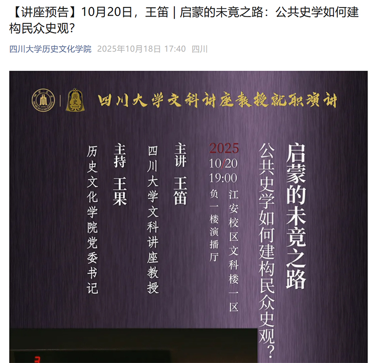 10月18日,“四川大学历史文化学院”微信公众号发布讲座预告:《10月20日,王笛 | 启蒙的未竟之路:公共史学如何建构民众史观?》。