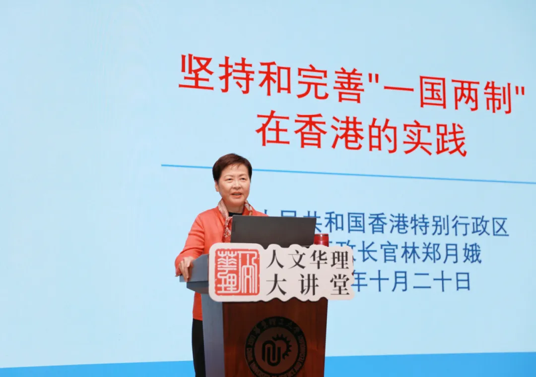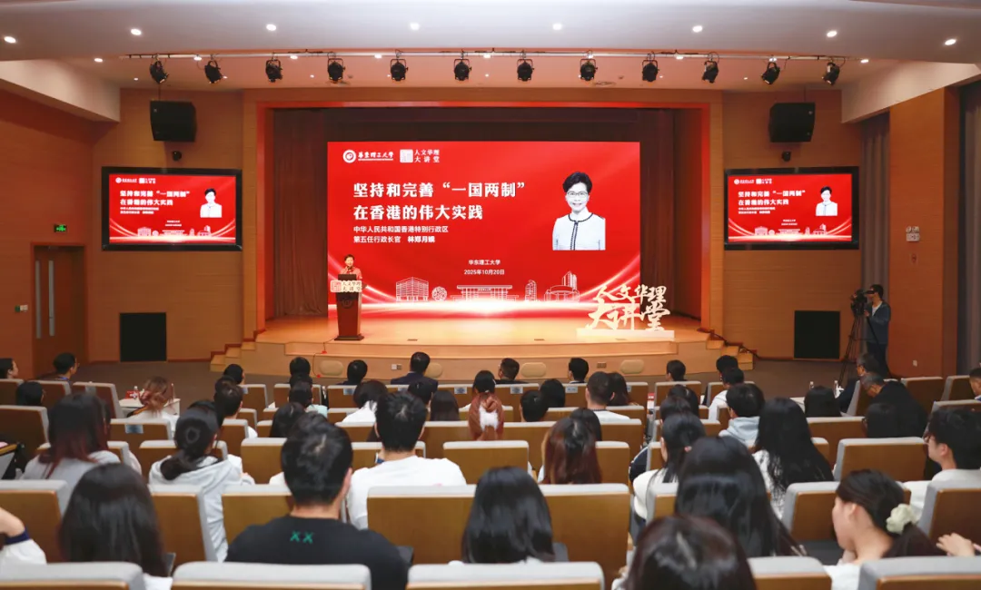 林郑月娥在报告中回顾了香港的发展历史与“一国两制”产生的历史背景,介绍了香港特区的宪制秩序、特区行政长官的宪制地位,并结合自身履职经历分享了担任香港特别行政区行政长官期间,在中央的支持下,依据《中华人民共和国宪法》和《中华人民共和国香港特别行政区基本法》,带领香港战胜诸多挑战的实践。她指出,“一国”是香港发展的根基与本源,“爱国者治港”原则为香港行稳致远奠定坚实基础,全面准确贯彻“一国两制”才能保持香港长期繁荣稳定。当前,“一国两制”实践进入新阶段,香港要继续发挥“背靠祖国、联通世界”的独特优势,为强国建设、民族复兴作出更大贡献。她还介绍了香港打造国际高端人才集聚高地和吸引海内外人才举措等内容,欢迎华理学子赴港深造与发展。