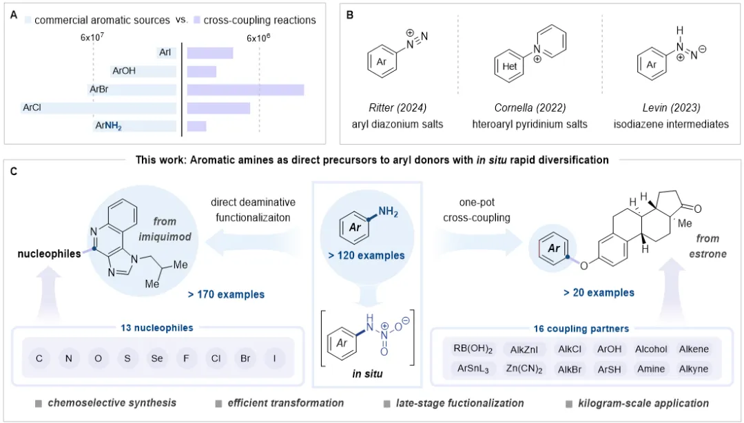 该团队刊登成果突破性提出了一种借助N-硝胺实现直接脱氨官能团化的全新方法,能够高效地将惰性芳香族碳-氮键直接转化为多种重要化学键(包括碳-卤素键、碳-氧键、碳-氮键及碳-碳键等)。该方案仅需使用实验室中常见普通的试剂,即能高效实现目标产物公斤级的规模化合成,颠覆了工业领域140年来沿用的传统工艺,为传统上广泛使用却因易爆性和高风险而受限的芳基重氮化学提供了一种安全、经济的新方案,有望在制药、材料制造等多个重要领域获得广泛应用。