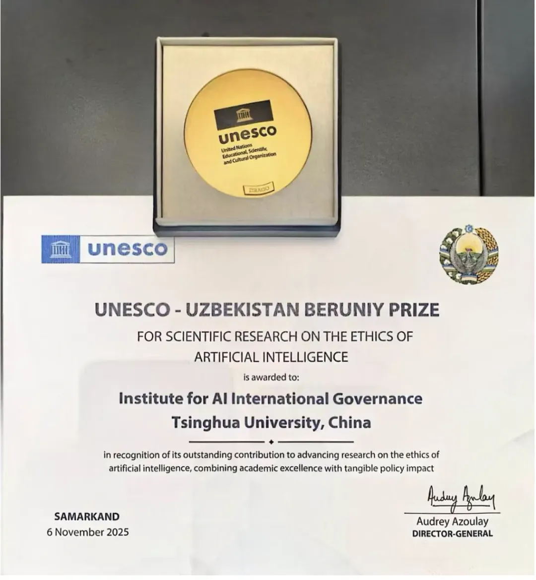 11月6日,首届联合国教科文组织—乌兹别克斯坦比鲁尼人工智能伦理科学研究奖(以下简称比鲁尼奖)颁奖仪式在乌兹别克斯坦撒马尔罕举行,清华大学人工智能国际治理研究院(以下简称研究院)荣获本届奖项唯一的机构奖。