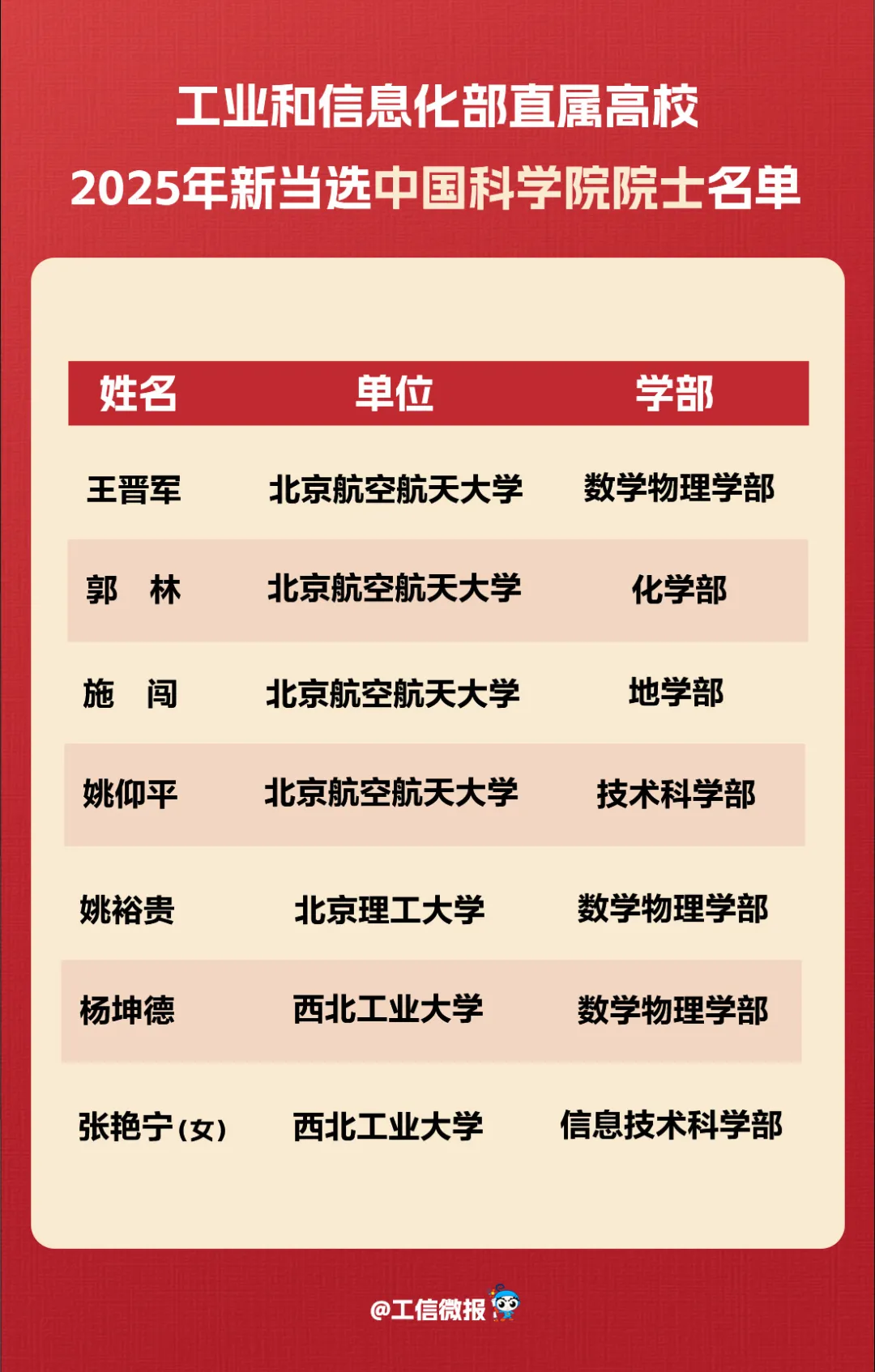 11月21日,中国科学院、中国工程院公布2025年院士增选结果,分别选举产生中国科学院院士73人、中国工程院院士71人。工业和信息化部直属高校共9人当选中国科学院、中国工程院院士,名单如下: