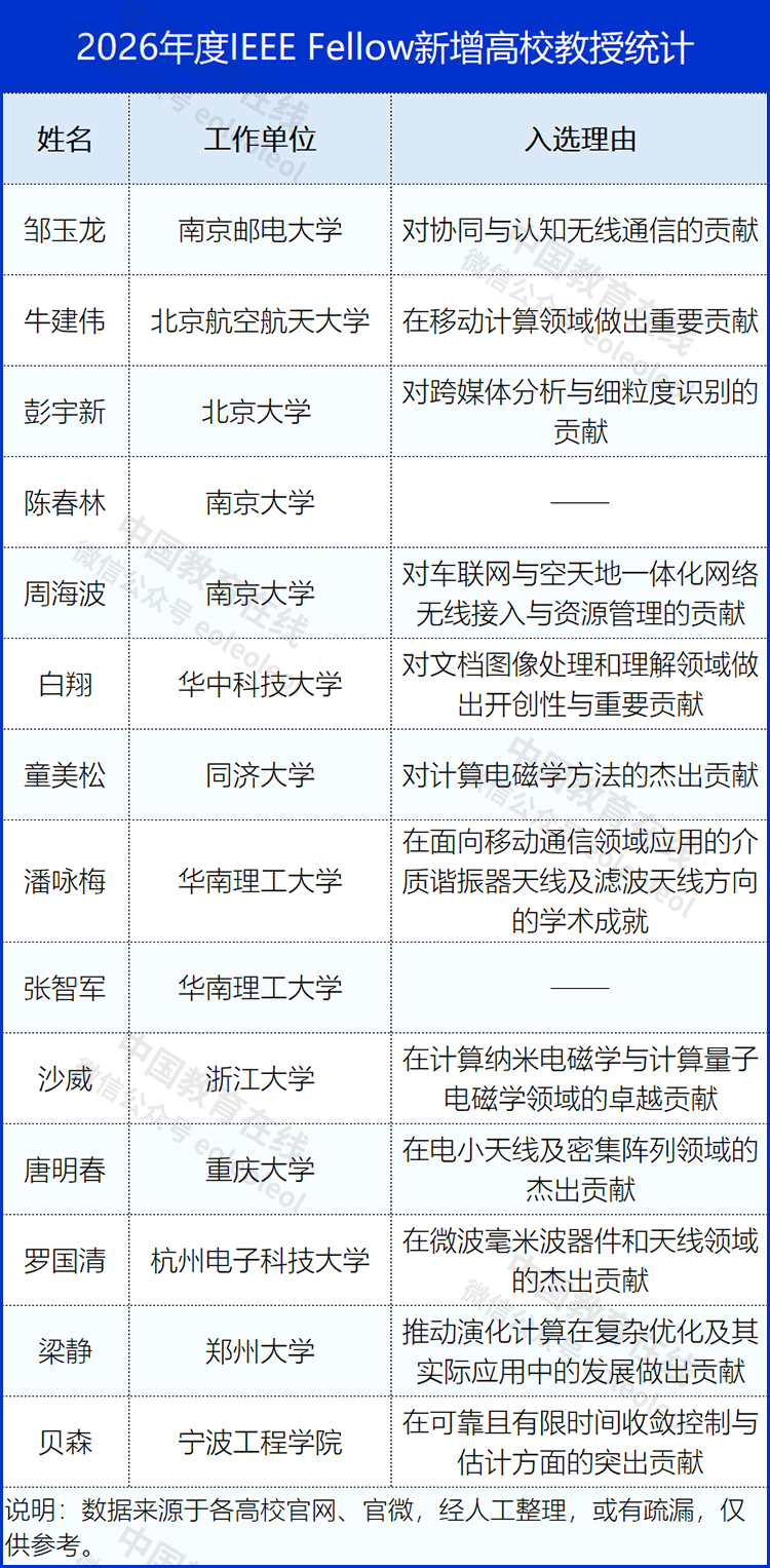 多所高校教授入选2026 IEEE Fellow!