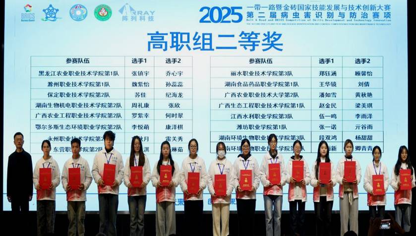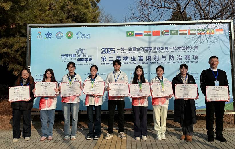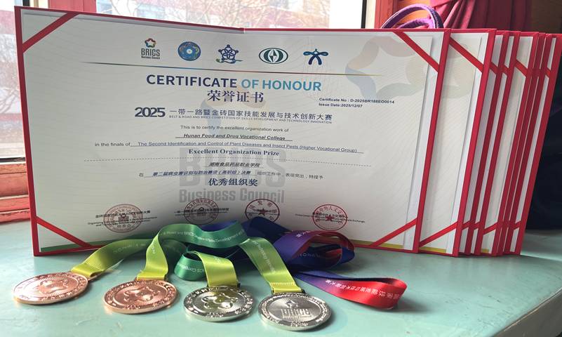 12月5日至7日,2025“一带一路”暨金砖国家技能发展与技术创新大赛第二届病虫害识别与防治赛项全国总决赛于辽宁农业职业技术学院圆满举办。湖南食品药品职业学院中药学院选派的三支代表队凭借扎实的专业技能以及出色的现场表现,最终荣获1项银牌、1项铜牌、1项优秀奖。指导教师林云、罗翀荣获“优秀指导教师”称号,学校获评“优秀组织奖”,充分展现了学校在技能人才培养和教育教学改革方面的坚实成效。
