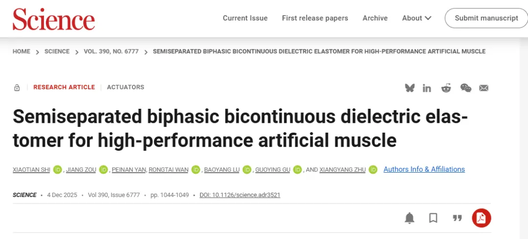 近日,江西科技师范大学柔性电子重点实验室主任、药学院院长卢宝阳教授在电驱动软体机器人研究领域取得重要进展,与上海交通大学合作的相关研究成果以题为 “Semiseparated biphasic bicontinuous dielectric elastomer for high-performance artificial muscle” 的论文发表在国际顶级期刊《Science》上。这是学校首篇《Science》论文,上海交通大学朱向阳教授、谷国迎教授和学校卢宝阳教授为论文的共同通讯作者,江西科技师范大学是共同通讯作者单位。