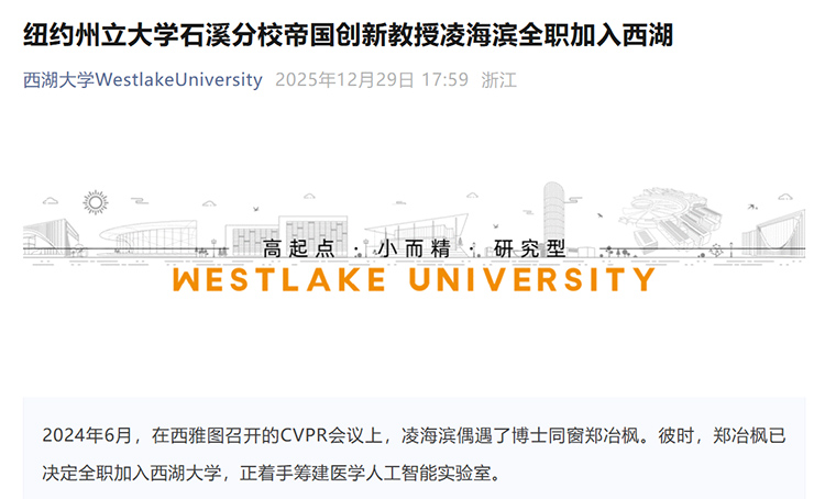 12月29日,西湖大学宣布:纽约州立大学石溪分校帝国创新教授、IEEE Fellow凌海滨全职加入西湖大学工学院,受聘讲席教授,牵头创立智能计算与应用实验室。