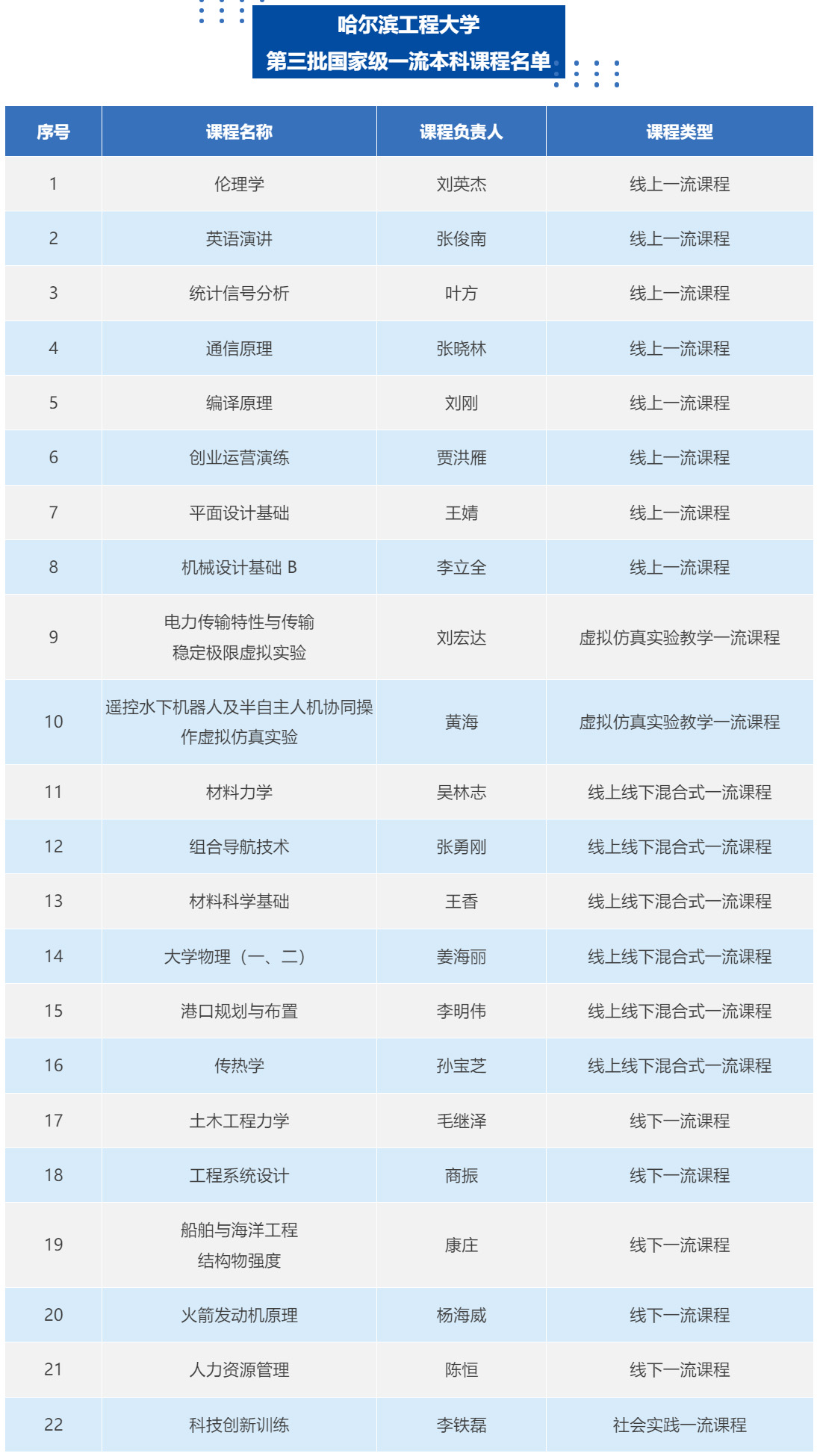 近日,教育部公布了第三批国家级一流本科课程认定结果,哈尔滨工程大学共有22门课程成功入选,包括线上课程8门、虚拟仿真实验教学课程2门、线上线下混合式课程6门、线下课程5门以及社会实践课程1门。