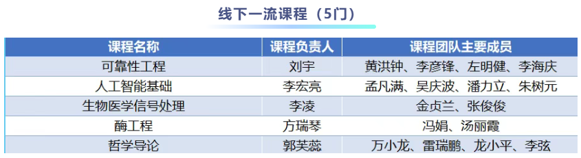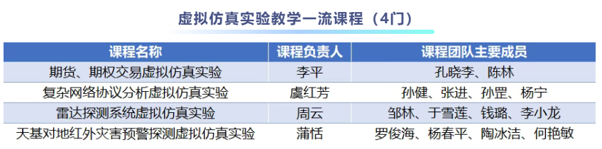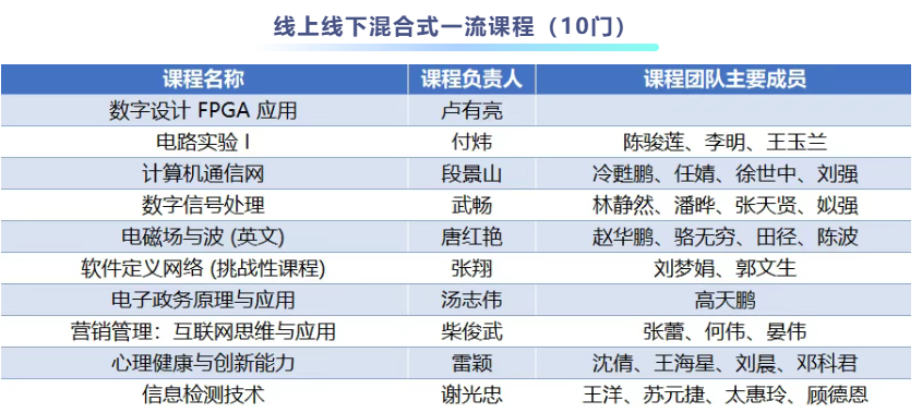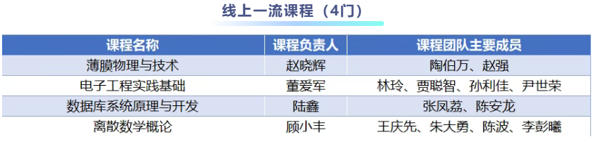 此次电子科技大学入选的国家级一流本科课程,包括线上一流课程4门、虚拟仿真实验教学一流课程4门、线上线下混合式一流课程10门、线下一流课程5门、社会实践一流课程1门。