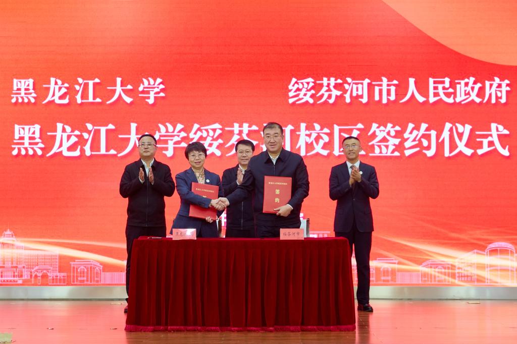 签约仪式上,黑龙江大学校长王敬波与牡丹江市委常委、绥芬河市委书记王镭分别代表双方签署黑龙江大学绥芬河校区合作协议。