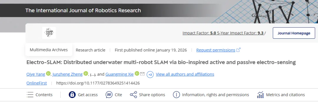 近日,北京大学先进制造与机器人学院谢广明团队在机器人领域国际顶级期刊The International Journal of Robotics Research(IJRR)上发表重要研究成果,提出Electro-SLAM——一种集成主动与被动电感知的分布式水下同步定位与建图(SLAM)系统。该研究为复杂、黑暗及浑浊水域中的水下机器人自主感知与协同作业提供了全新解决方案。该期刊是机器人领域公认的国际顶级学术期刊之一。该论文是北京大学作为第一完成单位在IJRR发表的首篇研究论文,标志着学校在水下机器人与新型感知SLAM研究方向取得重要突破。