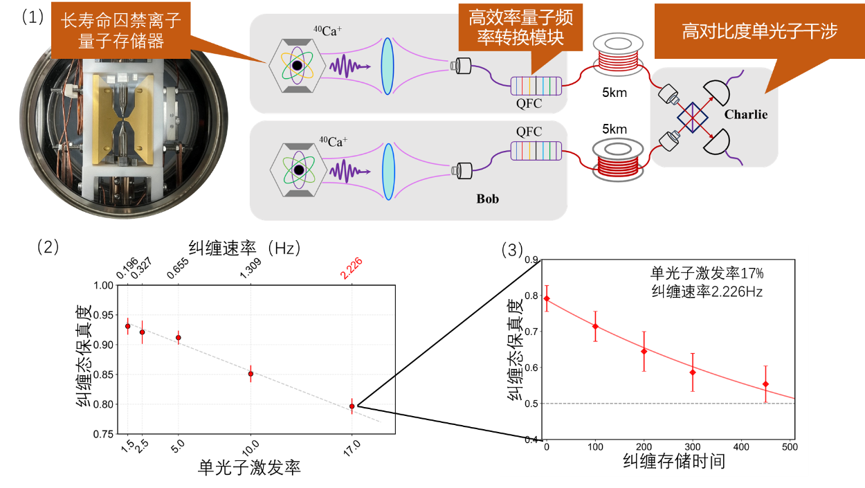 图3. 可扩展量子中继的基本模块原理图。(1)实验由长寿命囚禁离子量子储存器、高效率量子频率转换模块与高对比度单光子干涉模块组成。(2)纠缠建立速率为2.226赫兹,即等待时间约450毫秒。(3)纠缠寿命约550毫秒。