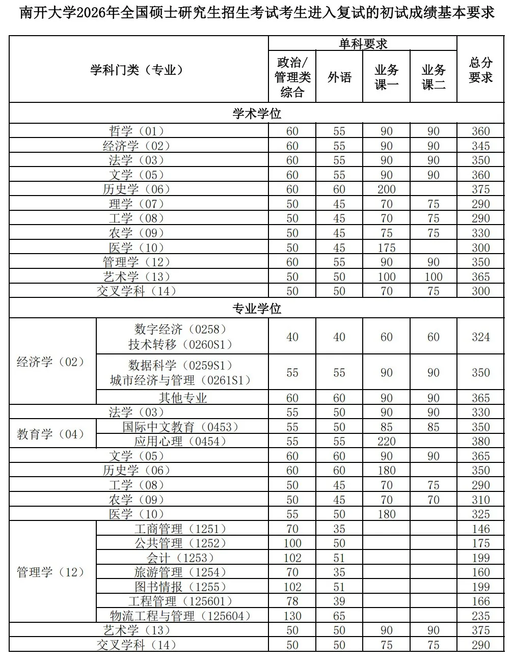 南开大学2026年全国硕士研究生招生考试考生进入复试的初试成绩基本要求(学校线)正式公布: