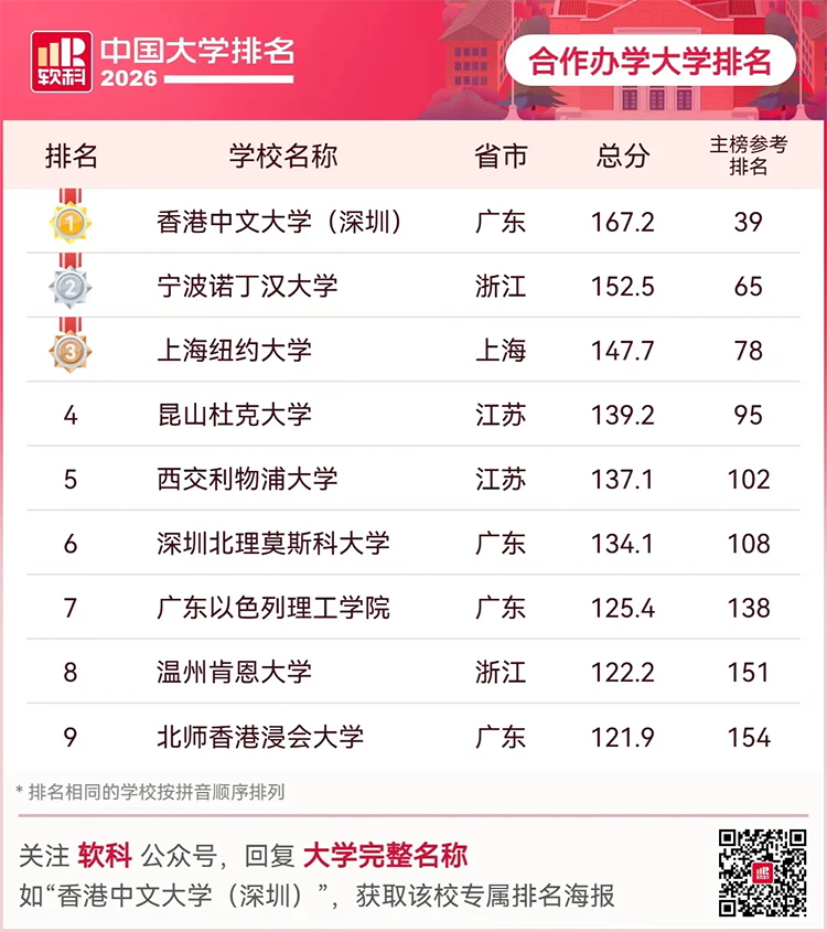 4月15日,高等教育专业评价机构软科正式发布 “2026软科中国大学排名”。宁波诺丁汉大学在全国1000多所参评高校中位列参考排名第65位,综合实力稳居“双一流”高校上游梯队;在中国合作大学榜单中高居第2位,办学实力再获权威认可。