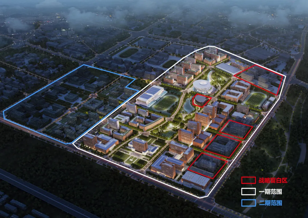 按照“整体规划、分期建设”的思路,一期规划用地面积700余亩,重点建设科研楼、教学楼、图书馆、体育馆、学生宿舍、食堂/能源中心、操场等;二期规划用地面积400余亩,重点布局产教融合、临床研究相关平台及机构。