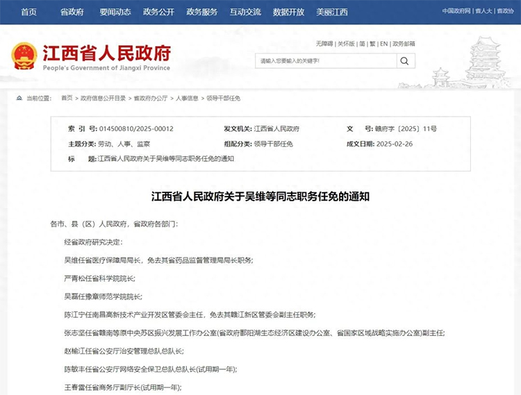 日前,江西省人民政府网站发布关于吴维等同志职务任免的通知。其中涉及豫章师范学院、东华理工大学、井冈山大学、赣南师范大学、赣南医科大学等10余所高校。
